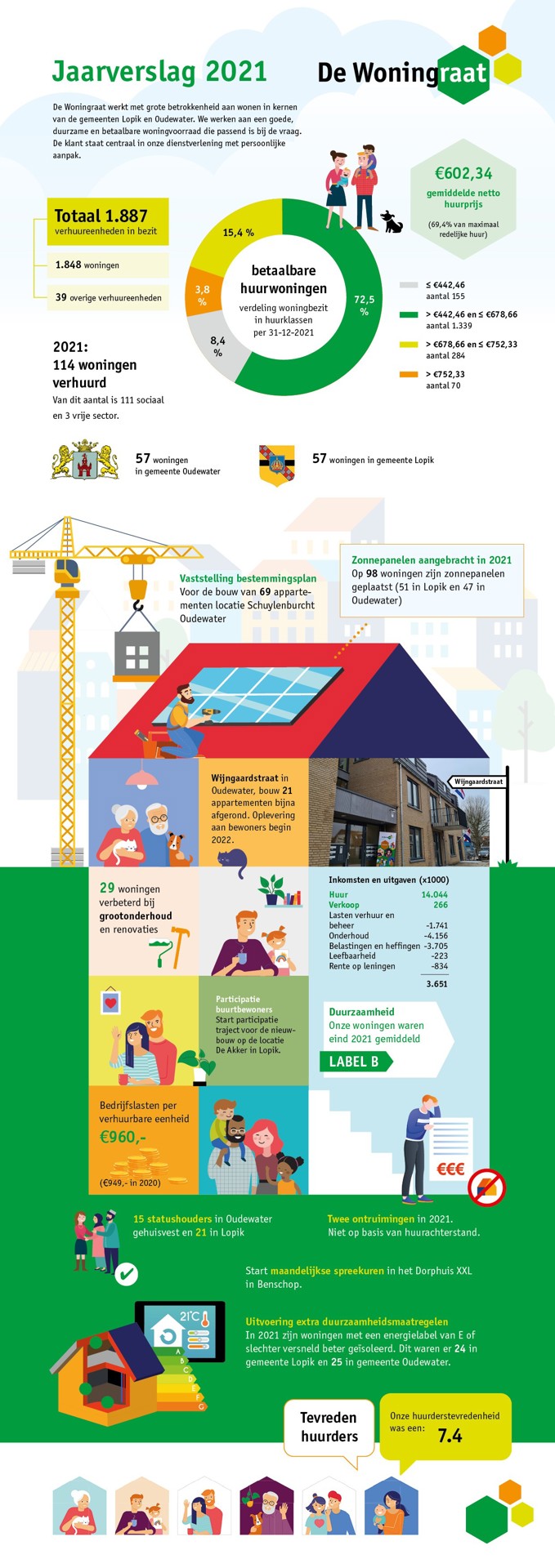 In ons infographic jaarverslag 2021 brengen we het jaarverslag terug tot een overzicht van kerncijfers en onze prestaties. Bijvoorbeeld de woningen die we hebben verhuurd in 2021, dat waren er ruim 100. Onze prestaties op gebied van duurzaamheid verdienen ook vermelding. Verder hebben we hard gewerkt aan het realiseren van nieuwe sociale huurwoningen.